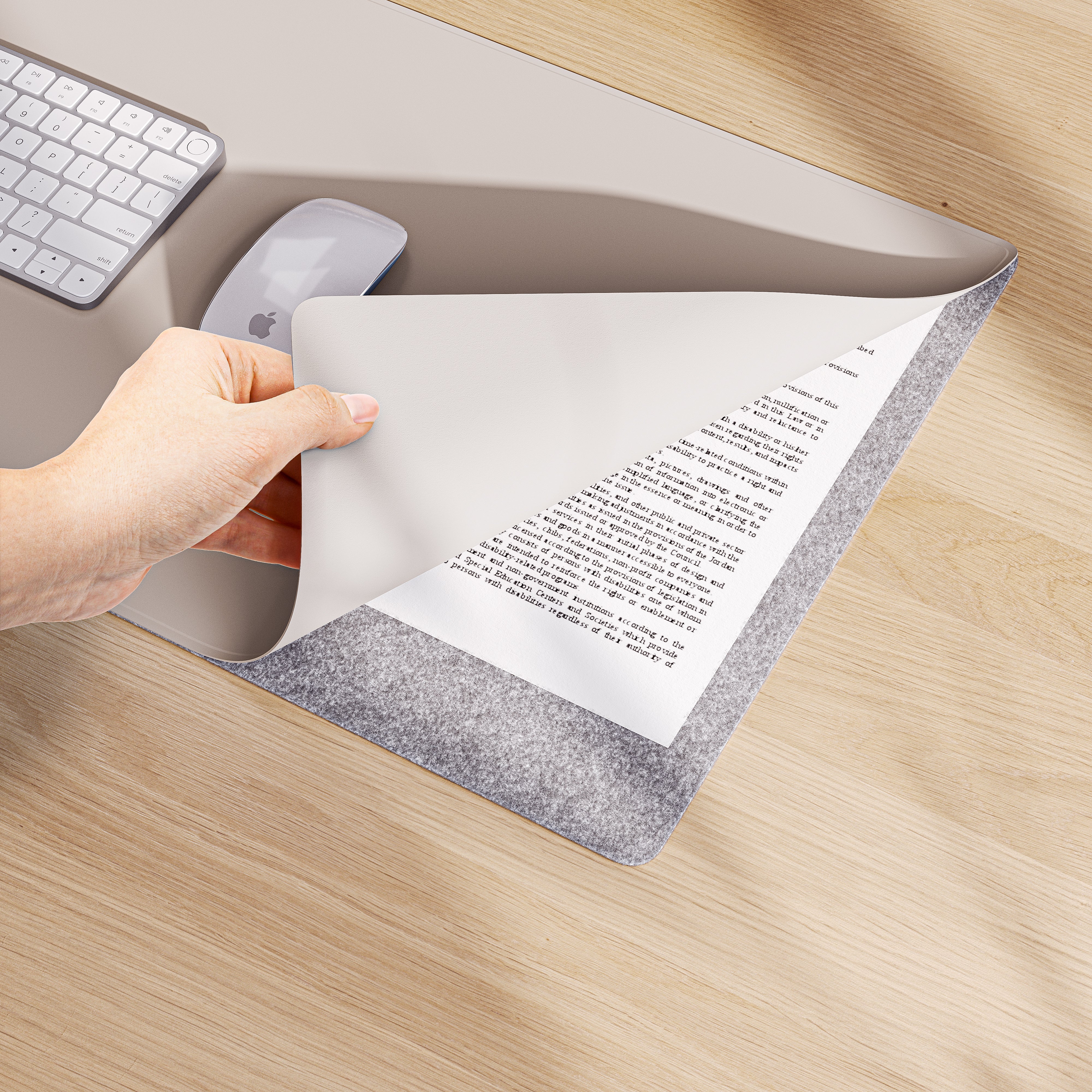 ALTI LIFT is a double-sided mat that includes a PU leather surface on one side, and a felt surface on the other. Its reversibility has aesthetic appeal for people who like to refresh the look at their desk. It also has practical advantages. Laptop users can switch surfaces for different tactile tasks. Some might prefer the vegan leather side for tasks that involve handwriting and others might prefer the felt leather surface to mute the sound of their keyboard when they type.