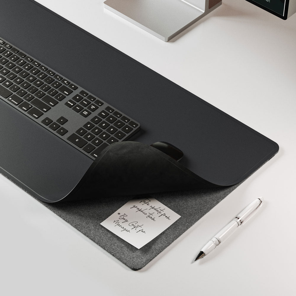 Experience the ultimate desk organization with our double-sided desk mat ALTI ULTRA. One side boasts a luxurious vegan leather surface, while the other offers soft felt. In between, you'll find a concealed document hideaway zone. Plus, it's equipped with a 15W MagSafe charging pad for your iPhone and wireless charging for your AirPods. Stay stylish and organized with this all-in-one desk mat.