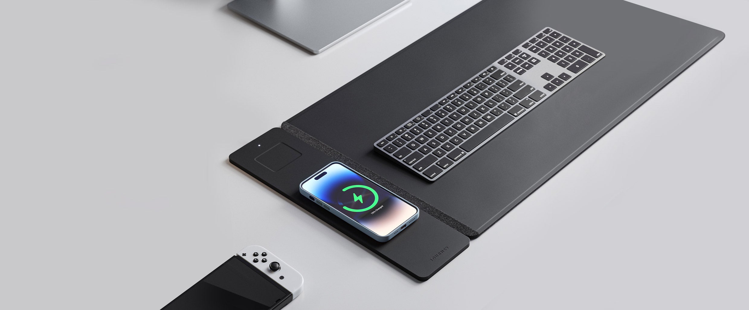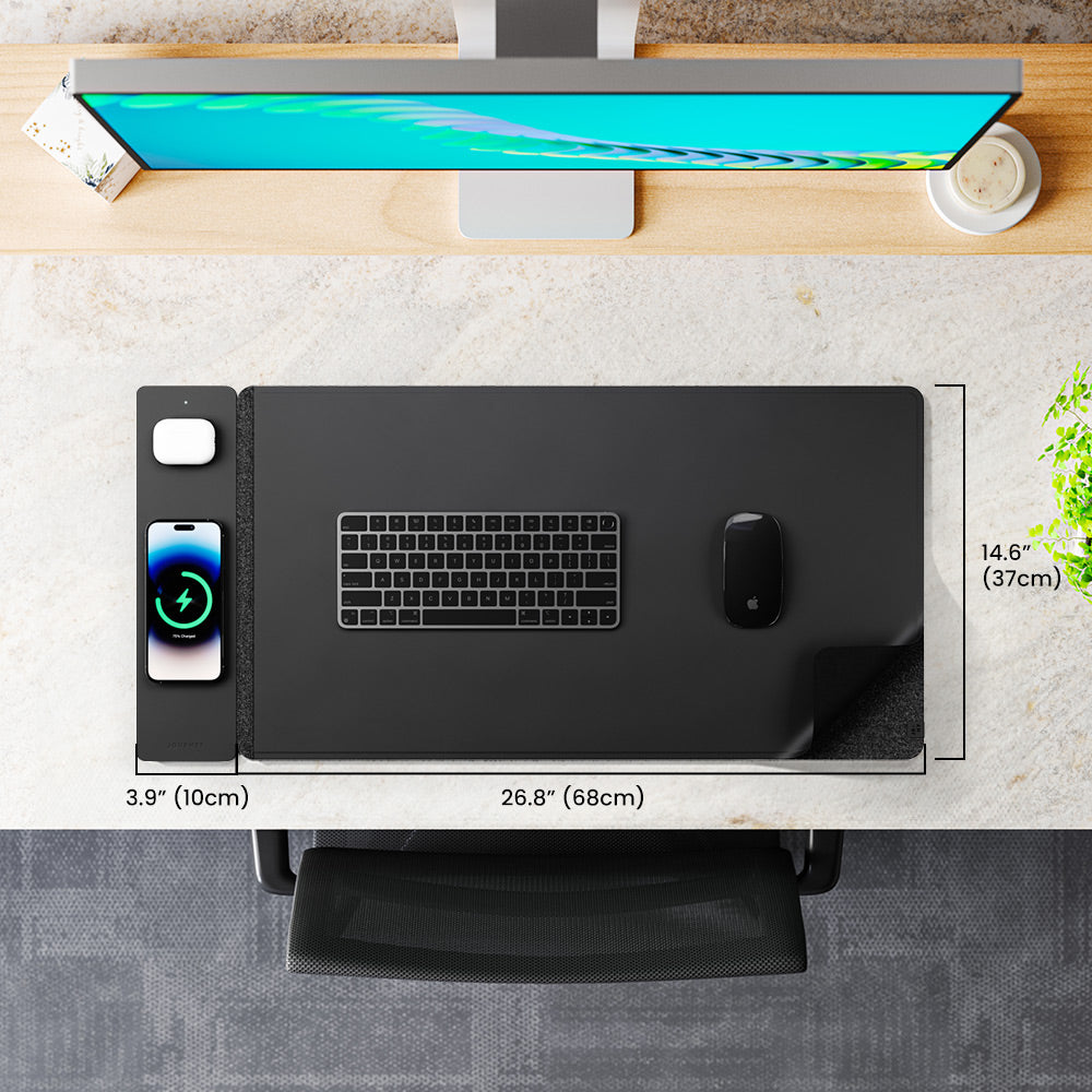 Reversible Desk Mat with in-built wireless charging panel that fast charges your smartphone and earbuds simultaneously. Features water-resistant vegan leather on one side and plush felt on the other side.